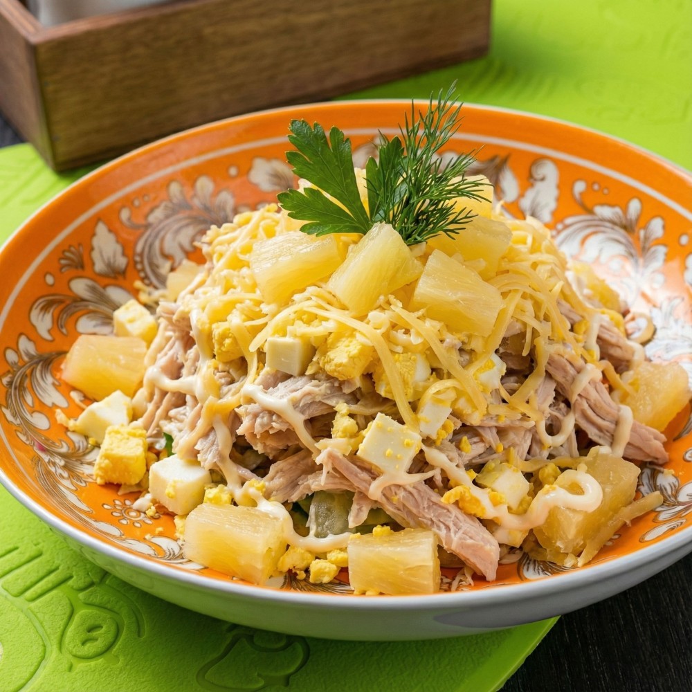 Курица, ананас консервированный, яйцо, сыр, майонез