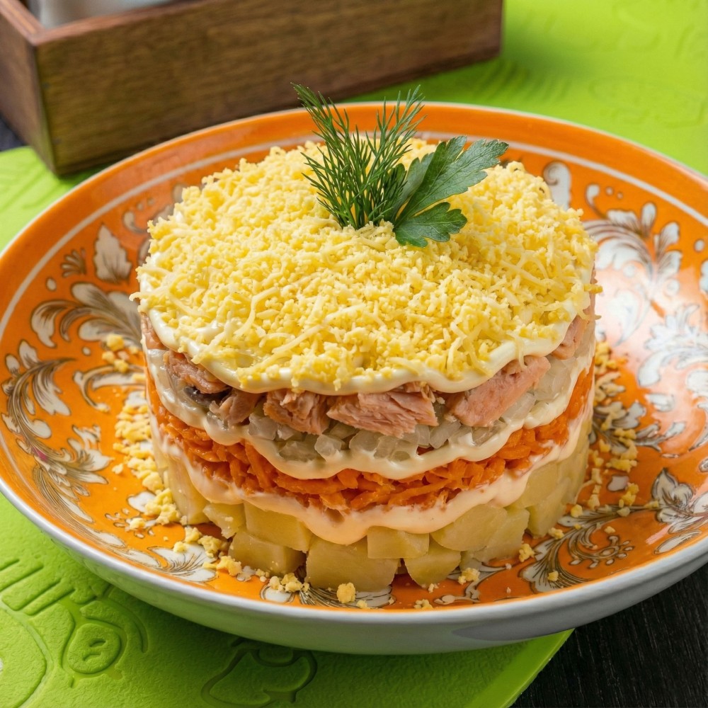 Картофель, морковь, форель, лук репчатый, соус цезарь, сыр