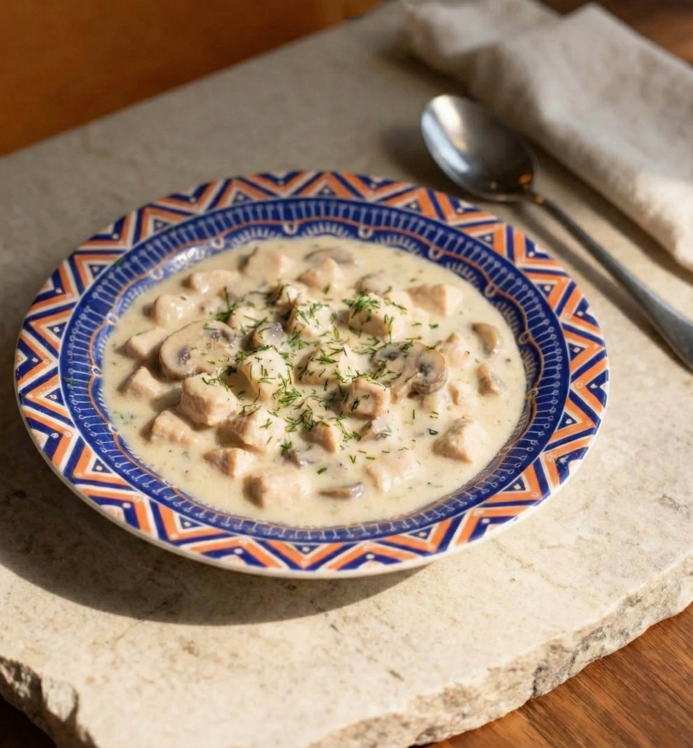 нежные кусочки куриного филе, тушённые с грибами в бархатистом сливочном соусе.
