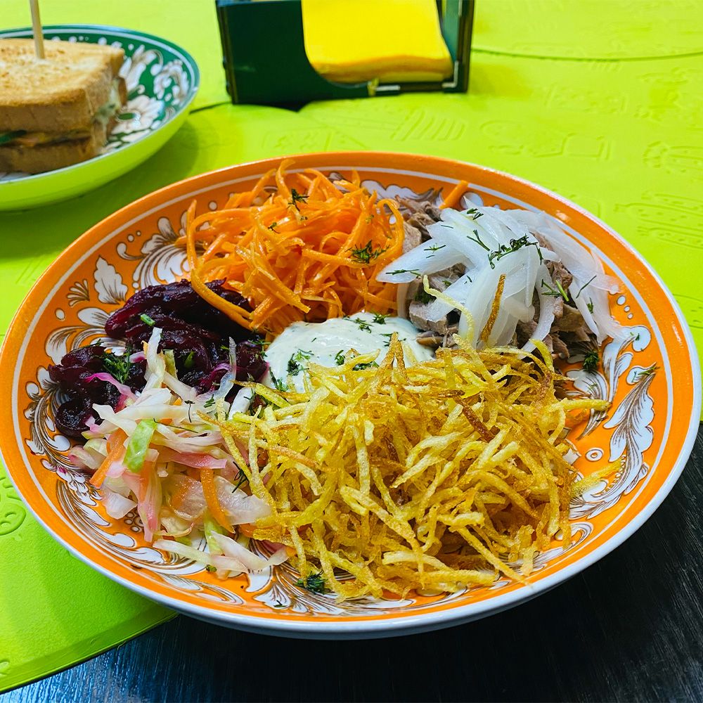 Морковь по-корейски, свекла, капустный салат, говядина, картофель пай, лук, соус французский