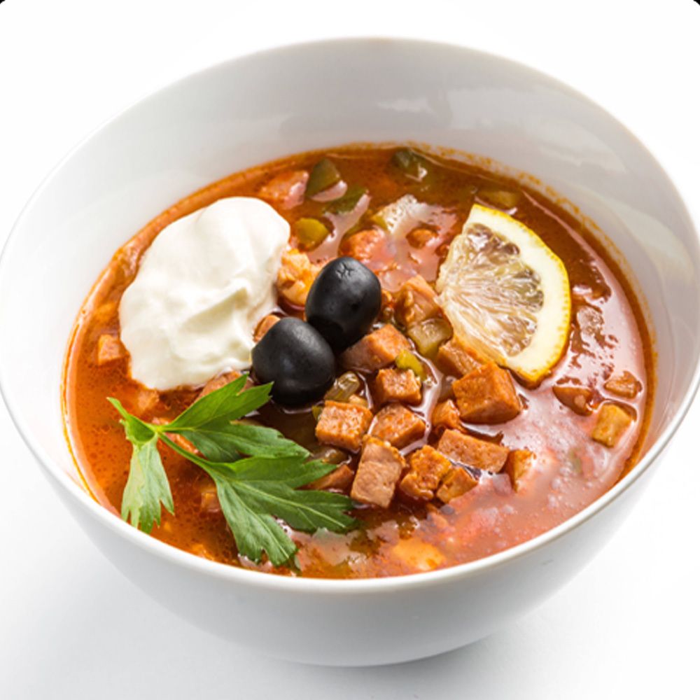 богатый, густой суп с пятью видами мясных деликатесов, солёными огурцами, оливками и лимоном.