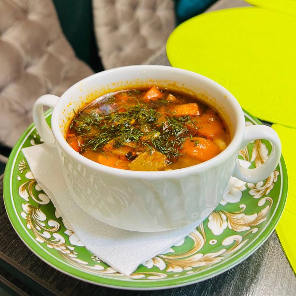 сытный суп узбекской кухни с длинной домашней лапшой, сочной говядиной и овощами в пряном бульоне.