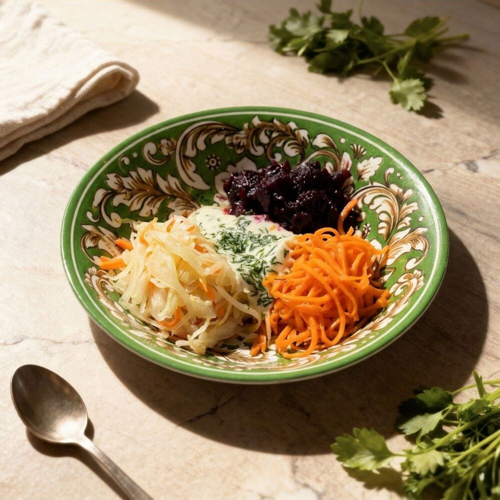 Морковь по-корейски, свекла, капуста маринованная, соус французский