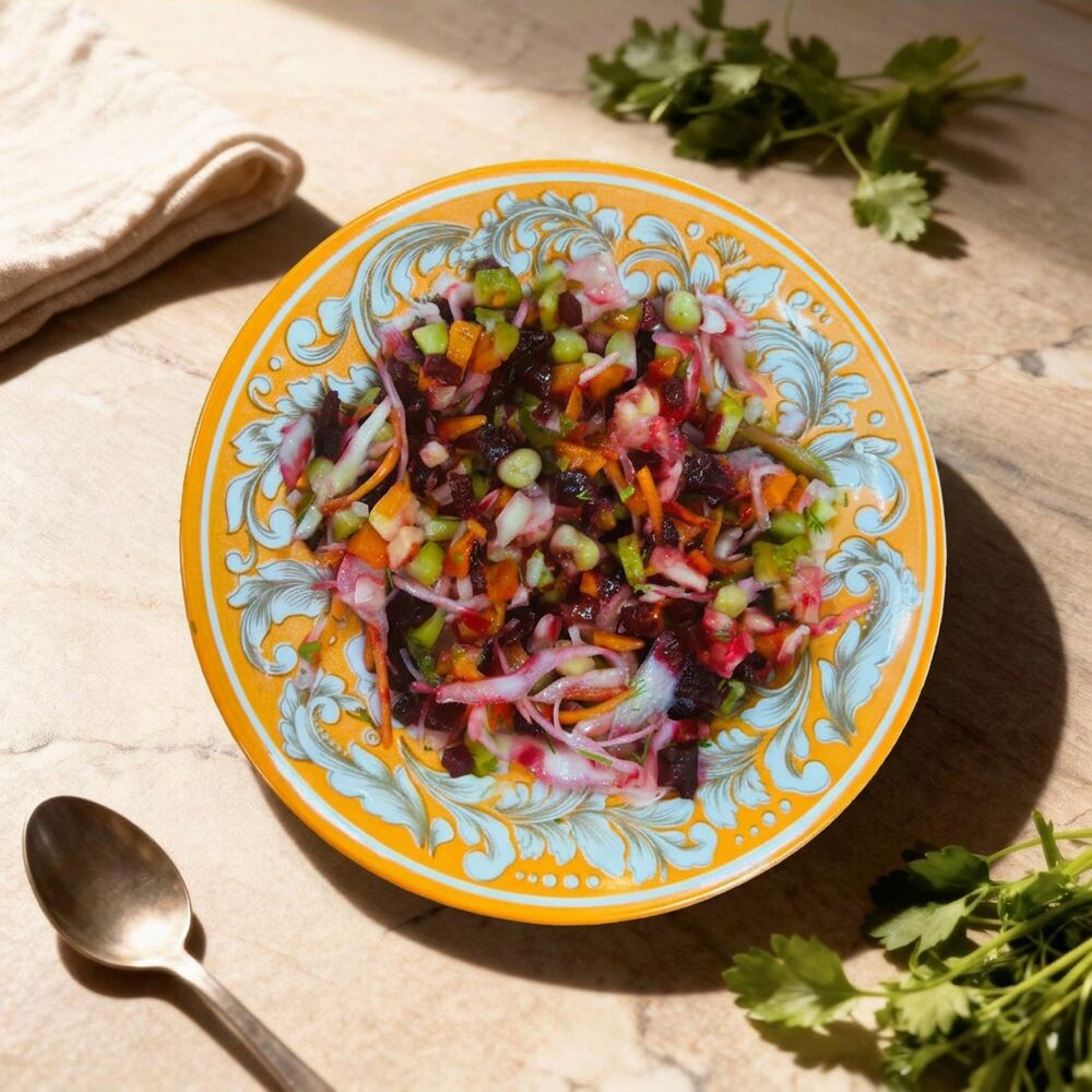 Капуста, свекла, морковь, картофель, горошек, лук, огурец мар., масло