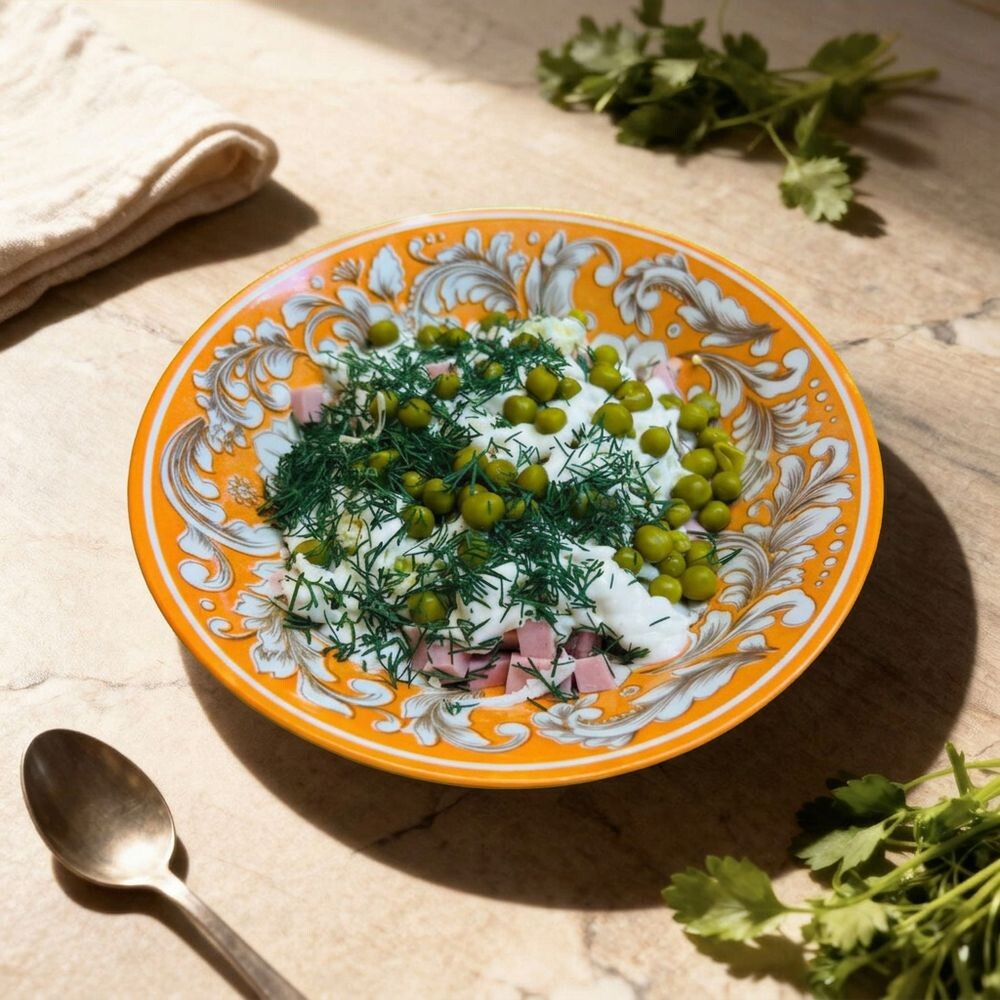 Морковь, горошек, картофель, яйцо, колбаса, огурец маринованный, майонез