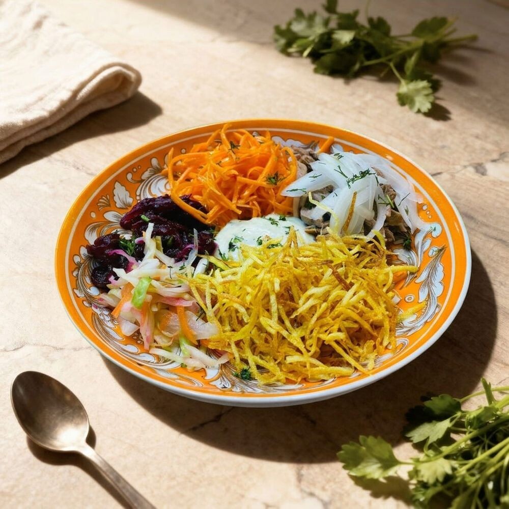 Морковь по-корейски, свекла, капуста маринованная, говядина, картофель пай, лук, соус французский