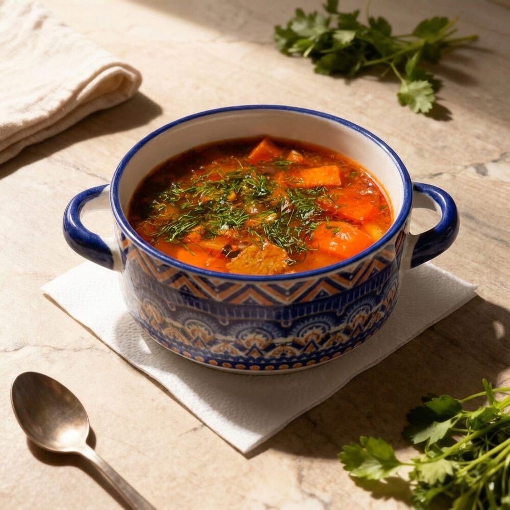 сытный суп узбекской кухни с длинной домашней лапшой, сочной говядиной и овощами в пряном насыщенном бульоне.