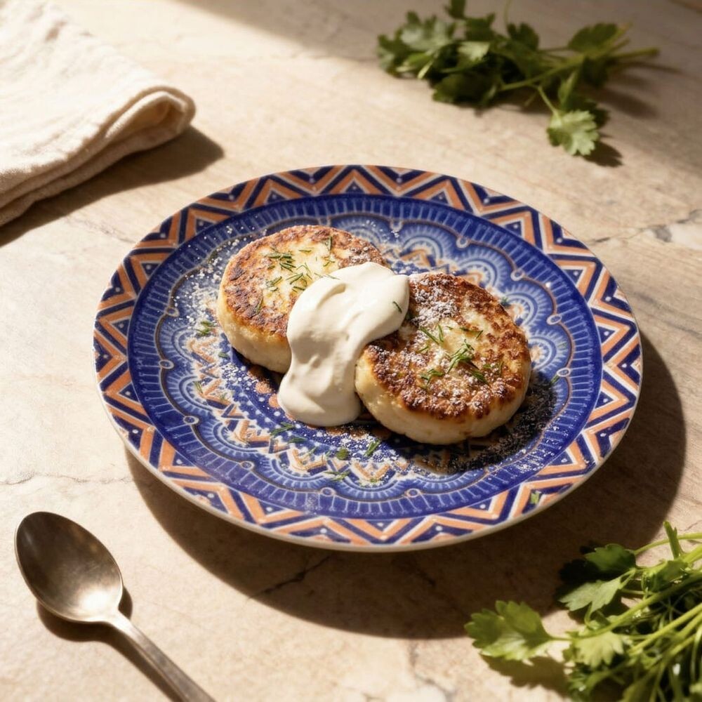пышные творожные сырники с золотистой корочкой, поданные со сметаной.