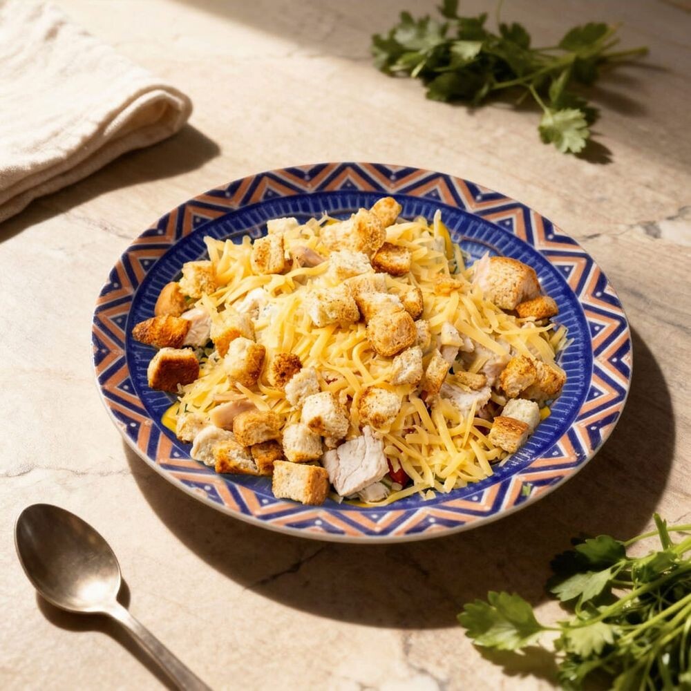 Куриное филе отв., соус французский, помидоры св., капуста пекинская, сыр твердый, сухарики